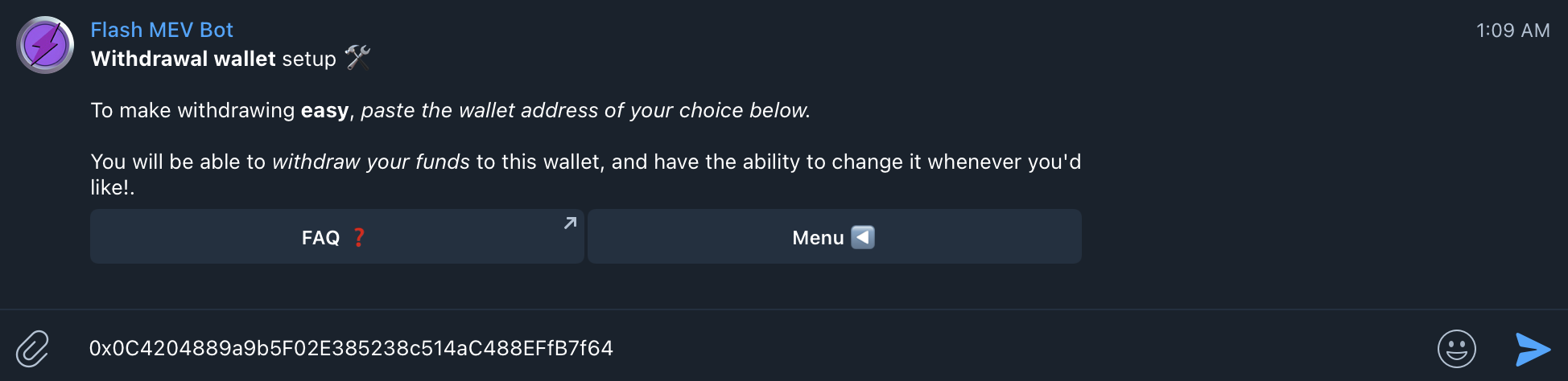 **To begin using FlashMEV’s publicly available set of MEV tools,  go to:** [**https://t.me/flashmevbot**](https://t.me/flashmevbot) **and click the “Start” button.**