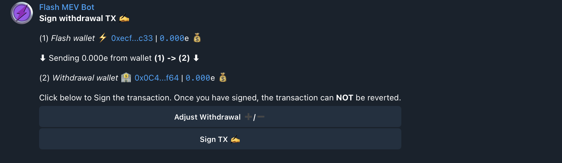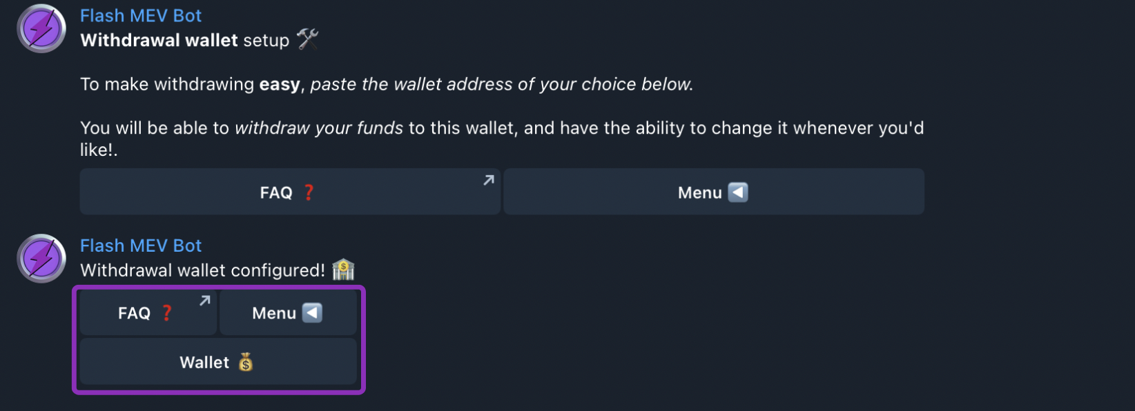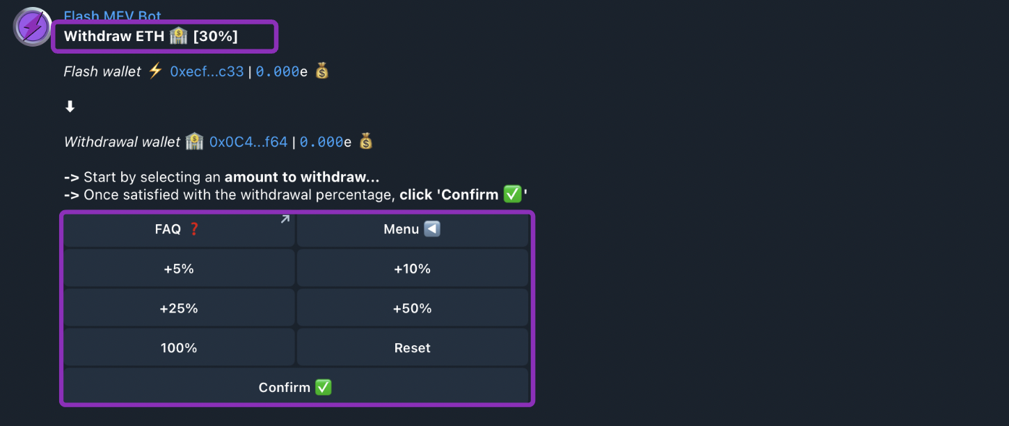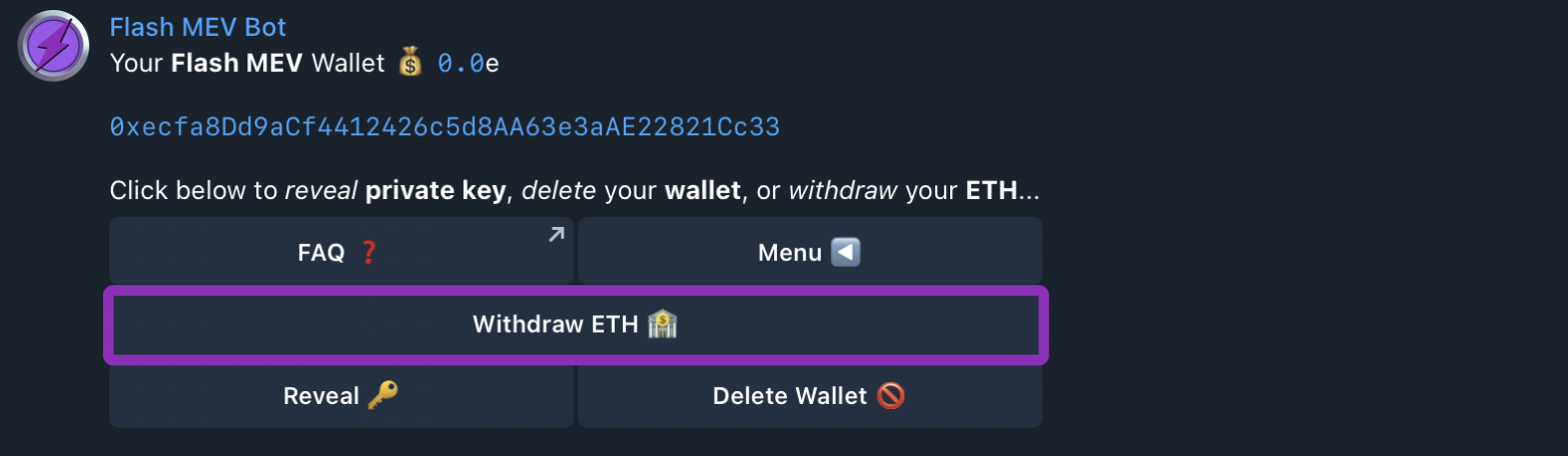 To permanently delete your Flash Wallet from the Bot, click the “Delete Wallet” button, then click the “Confirm” button.