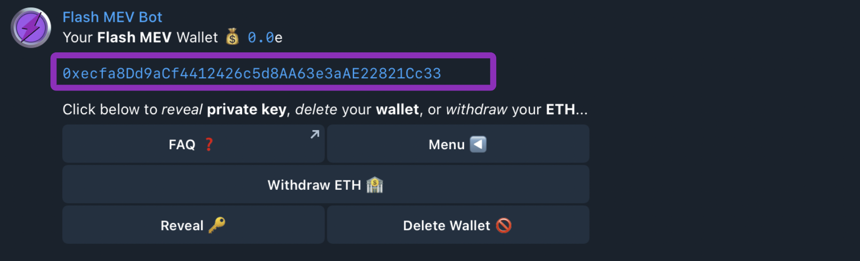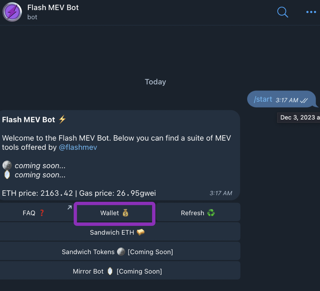 Before beginning to use the FlashMEV Bot, you must first generate and fund a Flash Wallet. To do this, start by clicking the “Wallets” Button on the Home Menu.
